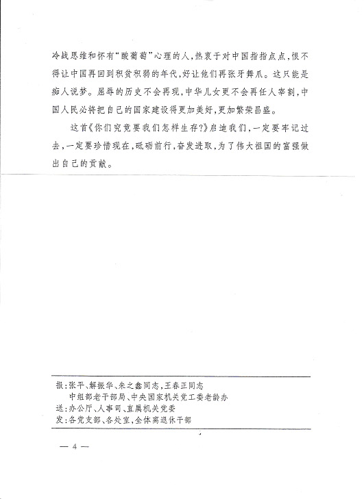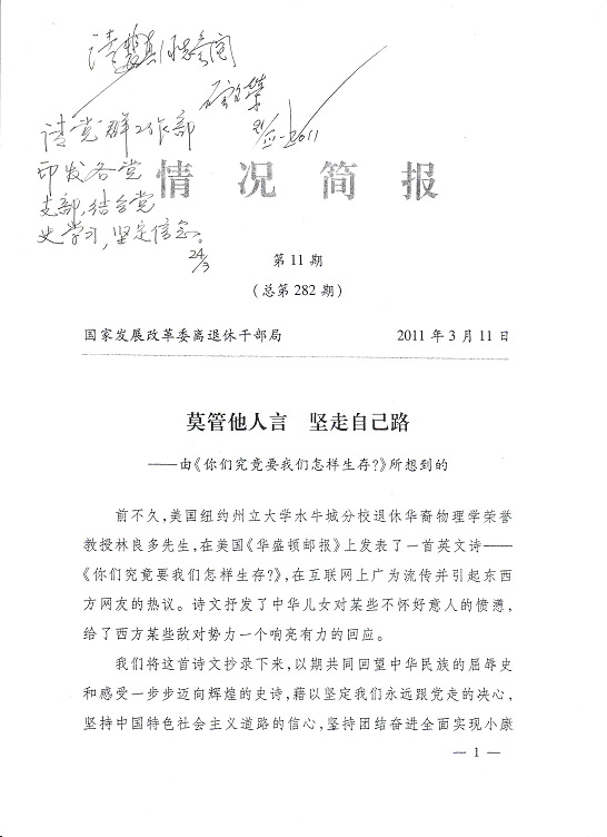 編者按:國家發(fā)改委離退休干部局《情況簡報(bào)》今年第11期刊載《莫管他人言堅(jiān)走自己路——由〈你們究竟要我們?cè)鯓由??〉所想到的》,是一篇洋溢著愛國主義情懷的好詩文,現(xiàn)根據(jù)公司領(lǐng)導(dǎo)的指示予以轉(zhuǎn)載,請(qǐng)各支部作為黨史學(xué)習(xí)的生動(dòng)教材,激發(fā)全體同志堅(jiān)定永遠(yuǎn)跟著黨走的決心,堅(jiān)持走中國特色社會(huì)主義道路,為全面實(shí)現(xiàn)小康社會(huì)而努力奮斗。