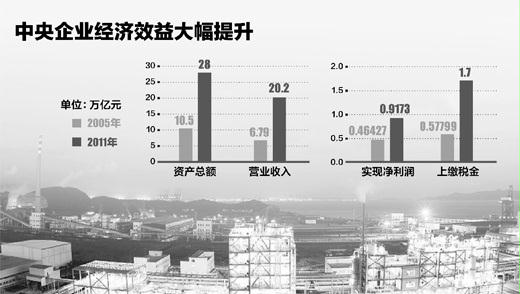 在1994年,我國最大的500家國有企業(yè)全年銷售收入的總和還不如美國通用汽車公司一家的銷售收入。甚至在2003年國務(wù)院國資委成立時,196家央企中的不少企業(yè)還在為不良資產(chǎn)處置發(fā)愁。而2011年公布的世界500強企業(yè)中,中央企業(yè)已有38家上榜。“十一五”的5年,中央企業(yè)資產(chǎn)總額、營業(yè)收入、上繳稅金和稅后凈利潤等主要經(jīng)營指標(biāo)均實現(xiàn)了翻番,年均國有資產(chǎn)保值增值率達(dá)到115%。