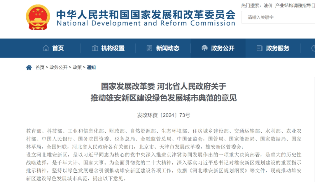 千年大計(jì)綠色為本 打造綠色發(fā)展新高地和城市建設(shè)新標(biāo)桿 ——《關(guān)于推動(dòng)雄安新區(qū)建設(shè)綠色發(fā)展城市典范的意見》解讀 張英健 木其堅(jiān) 近日,國家發(fā)展改革委、河北省人民政府聯(lián)合印發(fā)《關(guān)于推動(dòng)雄安新區(qū)建設(shè)綠色發(fā)展城市典范的意見》(發(fā)改環(huán)資〔2024〕73號(hào),以下簡(jiǎn)稱《意見》)。《意見》深入貫徹落實(shí)習(xí)近平總書記對(duì)雄安新區(qū)規(guī)劃建設(shè)的重要指示批示精神,堅(jiān)持以綠色發(fā)展理念引領(lǐng)推動(dòng)雄安新區(qū)建設(shè)各項(xiàng)工作,為雄安新區(qū)綠色高質(zhì)量發(fā)展明確了方向路徑,也為全國綠色高質(zhì)量發(fā)展提供了生動(dòng)實(shí)踐和鮮活樣本,具有非常重要的意義。 一、綠色是建設(shè)雄安新區(qū)的鮮明底色 河北雄安新區(qū)的設(shè)立,是千年大計(jì)、國家大事。習(xí)近平總書記從謀劃選址到規(guī)劃建設(shè),親自決策、親自部署、親自推動(dòng),傾注大量心血,為雄安新區(qū)規(guī)劃建設(shè)領(lǐng)航指路、把脈定向。從謀劃設(shè)立之初,習(xí)近平總書記就強(qiáng)調(diào)要堅(jiān)持生態(tài)優(yōu)先、綠色發(fā)展,劃定開發(fā)邊界和生態(tài)紅線,實(shí)現(xiàn)兩線合一,著力建設(shè)綠色、森林、智慧、水城一體的新區(qū)。2017年,雄安新區(qū)在規(guī)劃階段即圍繞綠色發(fā)展專門設(shè)置了綠色生態(tài)發(fā)展指標(biāo)體系、清潔能源利用、資源環(huán)境承載力、大氣環(huán)境綜合治理、綠色建筑標(biāo)準(zhǔn)等10余項(xiàng)專題,這充分體現(xiàn)了雄安新區(qū)在規(guī)劃之初就厚植了“綠色基因”。2023年,習(xí)近平總書記主持召開高標(biāo)準(zhǔn)高質(zhì)量推進(jìn)雄安新區(qū)建設(shè)座談會(huì)并發(fā)表重要講話,強(qiáng)調(diào)要貫徹綠水青山就是金山銀山的理念,堅(jiān)持綠色化、低碳化發(fā)展,把雄安新區(qū)建設(shè)成為綠色發(fā)展城市典范。 《意見》深入貫徹習(xí)近平總書記這一重要指示要求,提出要充分發(fā)揮雄安新區(qū)平地建新城的優(yōu)勢(shì),強(qiáng)化頂層設(shè)計(jì),注重統(tǒng)籌協(xié)調(diào),高標(biāo)準(zhǔn)高質(zhì)量推進(jìn)雄安新區(qū)城市建設(shè)與生態(tài)文明建設(shè),積極穩(wěn)妥推進(jìn)碳達(dá)峰碳中和,加快形成雄安新區(qū)綠色低碳發(fā)展的空間格局、產(chǎn)業(yè)結(jié)構(gòu)、生產(chǎn)方式、生活方式,持續(xù)鞏固生態(tài)環(huán)境治理成效,全面提升生態(tài)安全和綠色發(fā)展水平,建設(shè)人與自然和諧共生的綠色發(fā)展城市典范,樹立新時(shí)代美麗中國雄安樣板。應(yīng)當(dāng)說,《意見》繪制了一幅綠色雄安、美麗雄安畫卷。 二、分階段繪就綠色發(fā)展城市典范建設(shè)藍(lán)圖 雄安新區(qū)肩負(fù)著打造高質(zhì)量發(fā)展全國樣板的歷史重任。雄安新區(qū)圍繞高水平社會(huì)主義現(xiàn)代化城市建設(shè)目標(biāo),堅(jiān)持把綠色作為城市建設(shè)的底色,完善生態(tài)功能,拓展藍(lán)綠空間,推廣低碳模式,建設(shè)數(shù)字城市,打造新時(shí)代綠色發(fā)展新標(biāo)桿。短短6年里,雄安新區(qū)從無到有、從藍(lán)圖到實(shí)景,一座高水平現(xiàn)代化城市正在拔地而起,堪稱奇跡。一系列設(shè)計(jì)之初的綠色設(shè)想也正在變?yōu)楝F(xiàn)實(shí),如雄安自貿(mào)試驗(yàn)區(qū)交流展示中心等充分利用建筑光伏一體化和地源熱泵技術(shù),實(shí)現(xiàn)建筑電力能源的自給自足,一批高品質(zhì)的綠色學(xué)校、綠色醫(yī)院、綠色辦公、綠色住宅、綠色工業(yè)建筑等示范場(chǎng)景在近幾年也都逐步成型。下一階段,高標(biāo)準(zhǔn)高水平建設(shè)雄安新區(qū),也必須要牢牢把握黨中央關(guān)于雄安新區(qū)的功能定位、使命任務(wù)和原則要求,提高政治站位,保持歷史耐心,處理好近期目標(biāo)和中遠(yuǎn)期目標(biāo)、城市建設(shè)速度和人口聚集規(guī)模、產(chǎn)業(yè)轉(zhuǎn)移和產(chǎn)業(yè)升級(jí)、政府和市場(chǎng)、承接北京非首都功能疏解和城市自身發(fā)展、城市建設(shè)和周邊鄉(xiāng)村振興等重大關(guān)系,確保雄安新區(qū)建設(shè)和發(fā)展的正確方向。 《意見》堅(jiān)持把綠色作為高質(zhì)量發(fā)展的普遍形態(tài),堅(jiān)持生態(tài)優(yōu)先、綠色發(fā)展,科學(xué)提出了雄安新區(qū)建設(shè)綠色發(fā)展城市典范近、中、遠(yuǎn)期建設(shè)目標(biāo)。近期目標(biāo)注重夯實(shí)雄安新區(qū)綠色發(fā)展基礎(chǔ)。這一時(shí)期的工作重點(diǎn)主要是生態(tài)空間格局的構(gòu)建,到2030年“一淀、三帶、九片、多廊”的生態(tài)空間格局將初步構(gòu)建,城淀共生共榮的風(fēng)貌基本形成。中期目標(biāo)更加注重綠色軟實(shí)力的構(gòu)建。這一時(shí)期聚焦綠色產(chǎn)業(yè)、環(huán)境質(zhì)量、生態(tài)宜居的全面提升,到2035年城市綠化、環(huán)境質(zhì)量、藍(lán)綠空間都得到根本改善和顯著提升,綠色低碳現(xiàn)代產(chǎn)業(yè)格局初步確立,能效、碳排放等指標(biāo)達(dá)到國內(nèi)領(lǐng)先水平,成為綠色發(fā)展新高地和城市建設(shè)新標(biāo)桿。