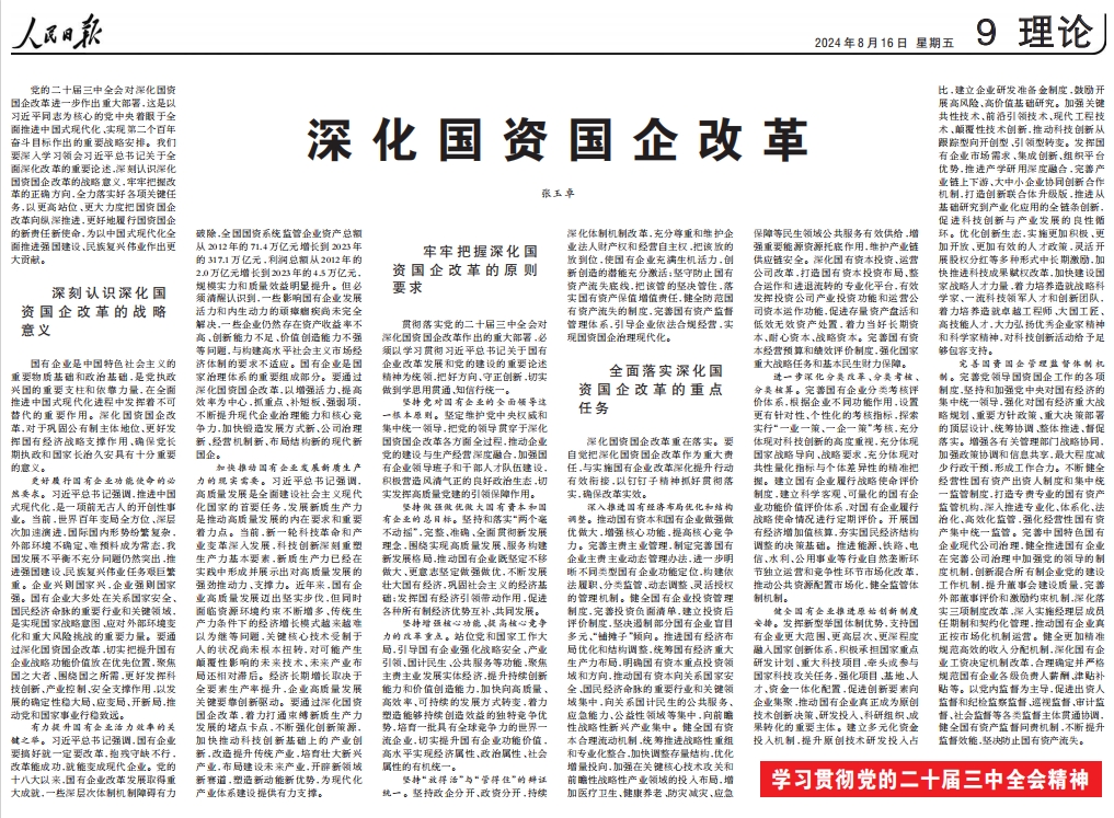 黨的二十屆三中全會對深化國資國企改革進一步作出重大部署,這是以習近平同志為核心的黨中央著眼于全面推進中國式現(xiàn)代化、實現(xiàn)第二個百年奮斗目標作出的重要戰(zhàn)略安排。我們要深入學習領(lǐng)會習近平總書記關(guān)于全面深化改革的重要論述,深刻認識深化國資國企改革的戰(zhàn)略意義,牢牢把握改革的正確方向,全力落實好各項關(guān)鍵任務,以更高站位、更大力度把國資國企改革向縱深推進,更好地履行國資國企的新責任新使命,為以中國式現(xiàn)代化全面推進強國建設(shè)、民族復興偉業(yè)作出更大貢獻。 深刻認識深化國資國企改革的戰(zhàn)略意義 國有企業(yè)是中國特色社會主義的重要物質(zhì)基礎(chǔ)和政治基礎(chǔ),是黨執(zhí)政興國的重要支柱和依靠力量,在全面推進中國式現(xiàn)代化進程中發(fā)揮著不可替代的重要作用。深化國資國企改革,對于鞏固公有制主體地位、更好發(fā)揮國有經(jīng)濟戰(zhàn)略支撐作用、確保黨長期執(zhí)政和國家長治久安具有十分重要的意義。 更好履行國有企業(yè)功能使命的必然要求。習近平總書記強調(diào),推進中國式現(xiàn)代化,是一項前無古人的開創(chuàng)性事業(yè)。當前,世界百年變局全方位、深層次加速演進,國際國內(nèi)形勢紛繁復雜,外部環(huán)境不確定、難預料成為常態(tài),我國發(fā)展不平衡不充分問題仍然突出,推進強國建設(shè)、民族復興偉業(yè)任務艱巨繁重。企業(yè)興則國家興,企業(yè)強則國家強。國有企業(yè)大多處在關(guān)系國家安全、國民經(jīng)濟命脈的重要行業(yè)和關(guān)鍵領(lǐng)域,是實現(xiàn)國家戰(zhàn)略意圖、應對外部環(huán)境變化和重大風險挑戰(zhàn)的重要力量。要通過深化國資國企改革,切實把提升國有企業(yè)戰(zhàn)略功能價值放在優(yōu)先位置,聚焦國之大者、圍繞國之所需,更好發(fā)揮科技創(chuàng)新、產(chǎn)業(yè)控制、安全支撐作用,以發(fā)展的確定性穩(wěn)大局、應變局、開新局,推動黨和國家事業(yè)行穩(wěn)致遠。 有力提升國有企業(yè)活力效率的關(guān)鍵之舉。習近平總書記強調(diào),國有企業(yè)要搞好就一定要改革,抱殘守缺不行,改革能成功,就能變成現(xiàn)代企業(yè)。黨的十八大以來,國有企業(yè)改革發(fā)展取得重大成就,一些深層次體制機制障礙有力破除,全國國資系統(tǒng)監(jiān)管企業(yè)資產(chǎn)總額從2012年的71.4萬億元增長到2023年的317.1萬億元,利潤總額從2012年的2.0萬億元增長到2023年的4.5萬億元,規(guī)模實力和質(zhì)量效益明顯提升。但必須清醒認識到,一些影響國有企業(yè)發(fā)展活力和內(nèi)生動力的頑瘴痼疾尚未完全解決,一些企業(yè)仍然存在資產(chǎn)收益率不高、創(chuàng)新能力不足、價值創(chuàng)造能力不強等問題,與構(gòu)建高水平社會主義市場經(jīng)濟體制的要求不適應。國有企業(yè)是國家治理體系的重要組成部分。要通過深化國資國企改革,以增強活力、提高效率為中心,抓重點、補短板、強弱項,不斷提升現(xiàn)代企業(yè)治理能力和核心競爭力,加快鍛造發(fā)展方式新、公司治理新、經(jīng)營機制新、布局結(jié)構(gòu)新的現(xiàn)代新國企。 加快推動國有企業(yè)發(fā)展新質(zhì)生產(chǎn)力的現(xiàn)實需要。習近平總書記強調(diào),高質(zhì)量發(fā)展是全面建設(shè)社會主義現(xiàn)代化國家的首要任務,發(fā)展新質(zhì)生產(chǎn)力是推動高質(zhì)量發(fā)展的內(nèi)在要求和重要著力點。當前,新一輪科技革命和產(chǎn)業(yè)變革深入發(fā)展,科技創(chuàng)新深刻重塑生產(chǎn)力基本要素,新質(zhì)生產(chǎn)力已經(jīng)在實踐中形成并展示出對高質(zhì)量發(fā)展的強勁推動力、支撐力。近年來,國有企業(yè)高質(zhì)量發(fā)展邁出堅實步伐,但同時面臨資源環(huán)境約束不斷增多、傳統(tǒng)生產(chǎn)力條件下的經(jīng)濟增長模式越來越難以為繼等問題,關(guān)鍵核心技術(shù)受制于人的狀況尚未根本扭轉(zhuǎn),對可能產(chǎn)生顛覆性影響的未來技術(shù)、未來產(chǎn)業(yè)布局還相對滯后。經(jīng)濟長期增長取決于全要素生產(chǎn)率提升,企業(yè)高質(zhì)量發(fā)展關(guān)鍵要靠創(chuàng)新驅(qū)動。要通過深化國資國企改革,著力打通束縛新質(zhì)生產(chǎn)力發(fā)展的堵點卡點,不斷強化創(chuàng)新策源,加快推動科技創(chuàng)新基礎(chǔ)上的產(chǎn)業(yè)創(chuàng)新,改造提升傳統(tǒng)產(chǎn)業(yè),培育壯大新興產(chǎn)業(yè),布局建設(shè)未來產(chǎn)業(yè),開辟新領(lǐng)域新賽道,塑造新動能新優(yōu)勢,為現(xiàn)代化產(chǎn)業(yè)體系建設(shè)提供有力支撐。 牢牢把握深化國資國企改革的原則要求 貫徹落實黨的二十屆三中全會對深化國資國企改革作出的重大部署,必須以學習貫徹習近平總書記關(guān)于國有企業(yè)改革發(fā)展和黨的建設(shè)的重要論述精神為統(tǒng)領(lǐng),把好方向、守正創(chuàng)新,切實做到學思用貫通、知信行統(tǒng)一。 堅持黨對國有企業(yè)的全面領(lǐng)導這一根本原則。堅定維護黨中央權(quán)威和集中統(tǒng)一領(lǐng)導,把黨的領(lǐng)導貫穿于深化國資國企改革各方面全過程,推動企業(yè)黨的建設(shè)與生產(chǎn)經(jīng)營深度融合,加強國有