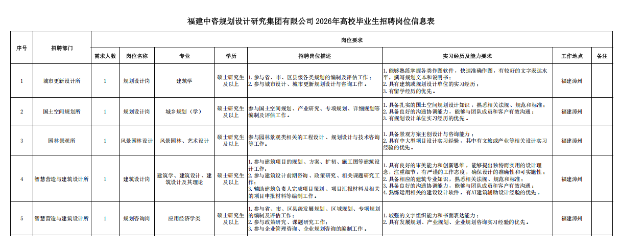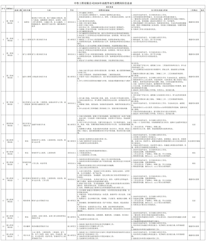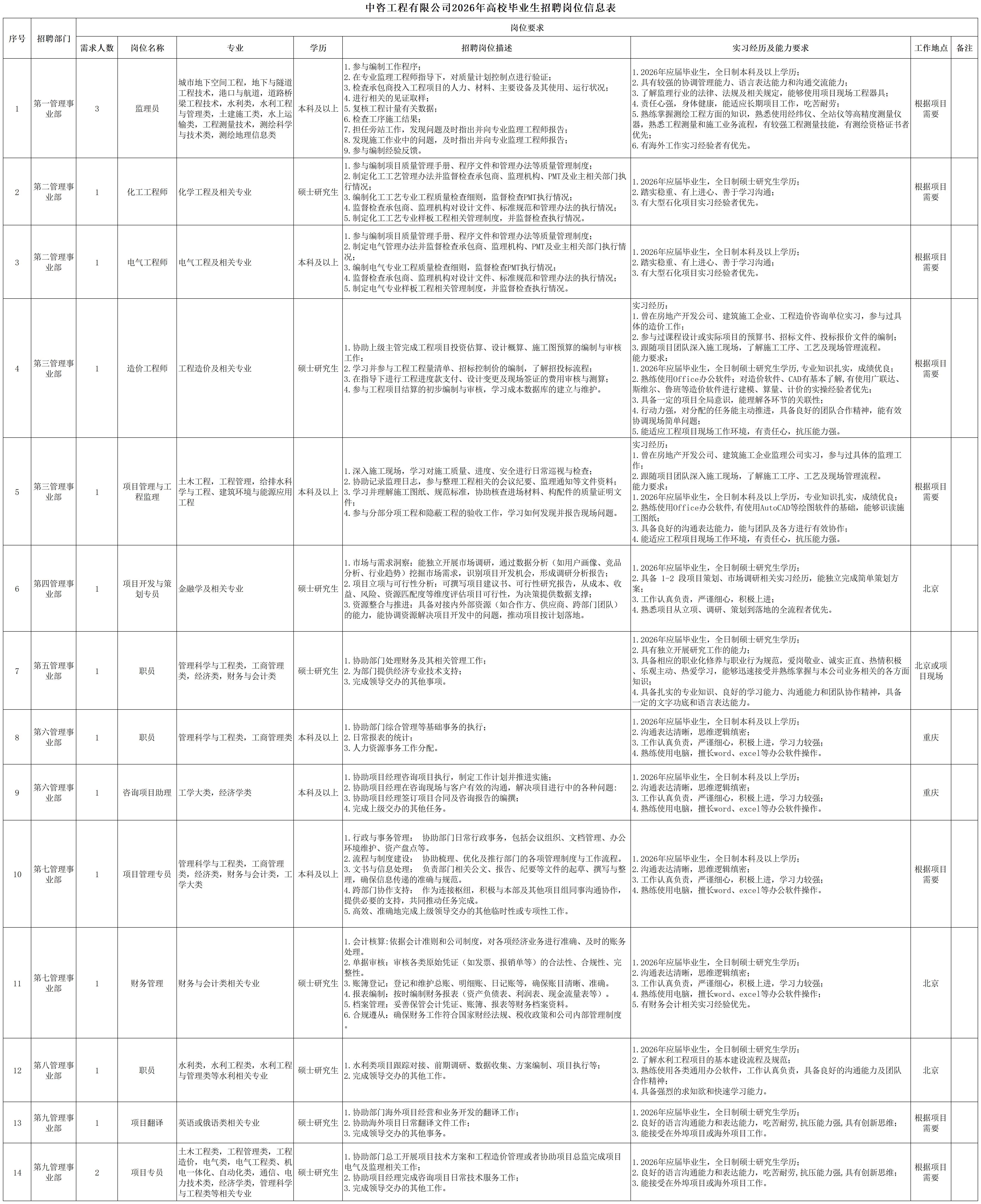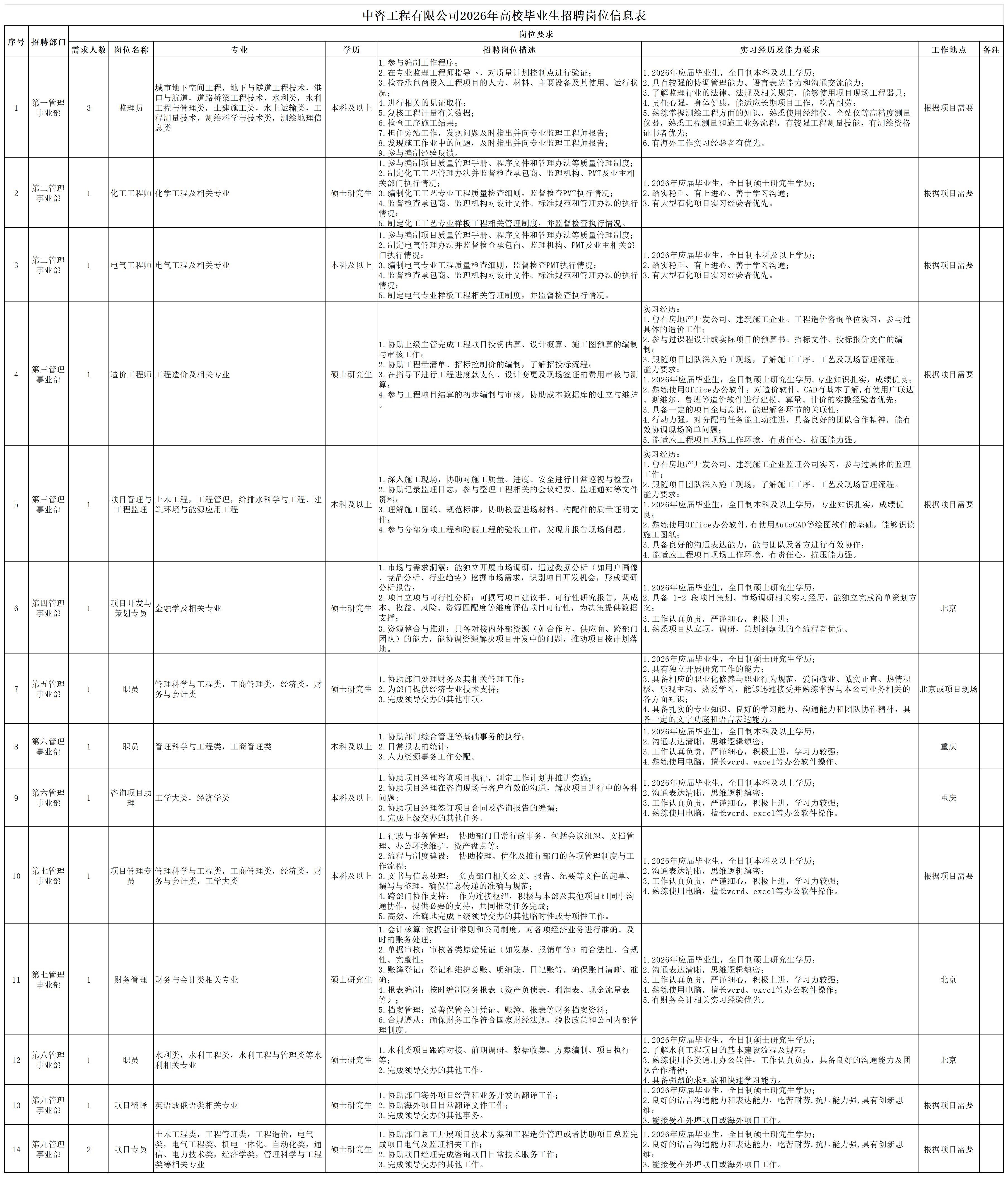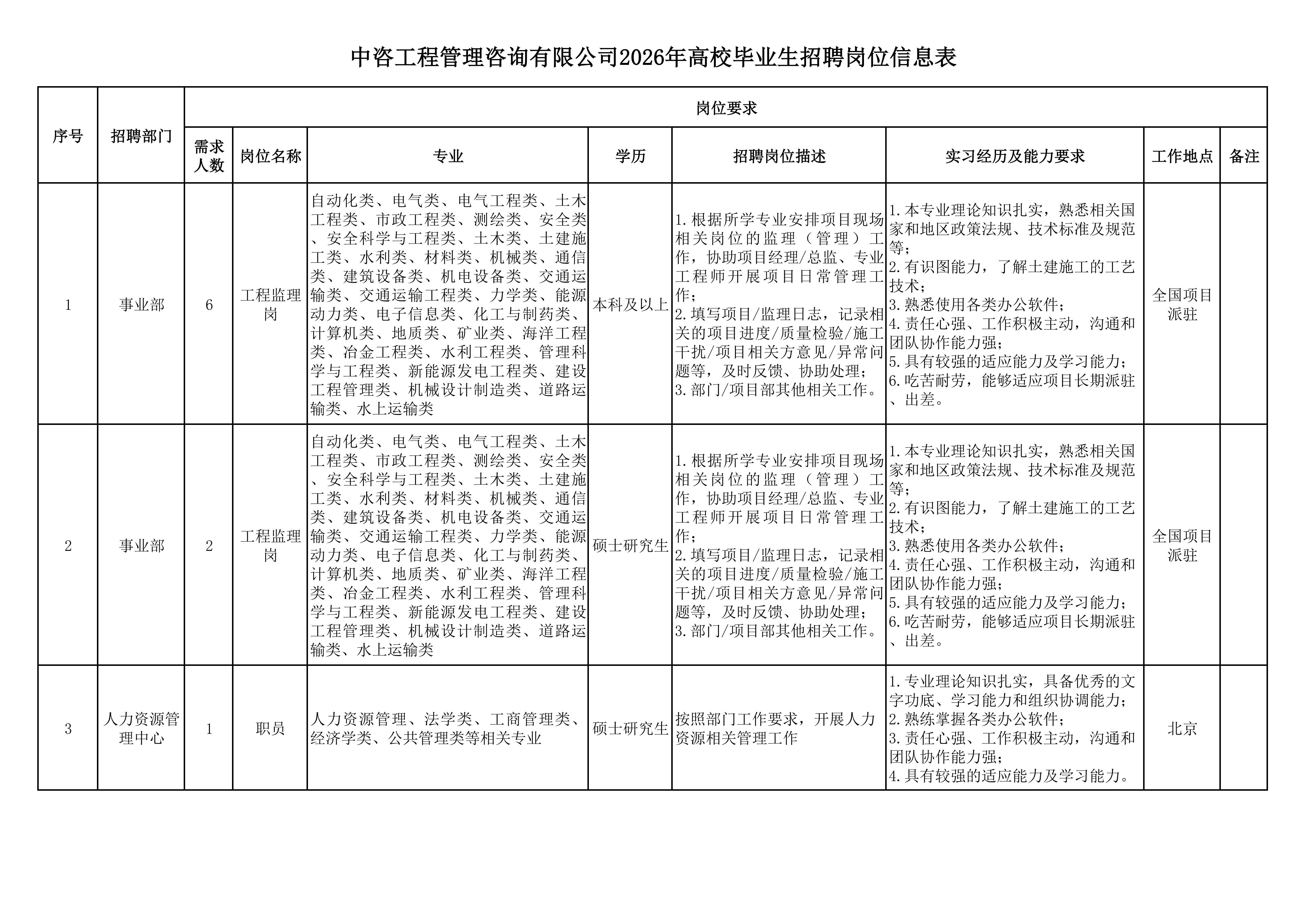 一、公司簡(jiǎn)介 中咨工程管理咨詢有限公司(簡(jiǎn)稱中咨管理)成立于1989年,是中國(guó)國(guó)際工程咨詢有限公司的核心骨干子公司,注冊(cè)資金1.55億元。現(xiàn)有各項(xiàng)資質(zhì)證書持證2800余冊(cè),中高級(jí)職稱比例超50%。 中咨管理公司是國(guó)內(nèi)從事工程管理類業(yè)務(wù)最早、規(guī)模最大、行業(yè)最廣、業(yè)績(jī)最多的企業(yè)之一,具有工程咨詢甲級(jí)資信、工程監(jiān)理綜合資質(zhì)以及設(shè)備、公路工程、地質(zhì)災(zāi)害防治工程、人民防空工程等多項(xiàng)專業(yè)監(jiān)理甲級(jí)資質(zhì),并列入政府采購(gòu)招標(biāo)代理機(jī)構(gòu)和中央投資項(xiàng)目招標(biāo)代理機(jī)構(gòu)名單。業(yè)務(wù)涵蓋工程前期咨詢、項(xiàng)目管理、項(xiàng)目代建、招標(biāo)代理、造價(jià)咨詢、工程監(jiān)理、設(shè)備監(jiān)理、設(shè)計(jì)優(yōu)化、工程質(zhì)量安全評(píng)估咨詢等項(xiàng)目全過程咨詢服務(wù),涉及房屋建筑、交通、石化、水利、電力、冶煉、礦山、市政、生態(tài)環(huán)境、通信和信息化等多個(gè)行業(yè)。業(yè)務(wù)遍布全國(guó)及全球近50個(gè)國(guó)家和地區(qū),累計(jì)服務(wù)各類咨詢管理項(xiàng)目超過1萬個(gè),涉及工程建設(shè)投資近5萬億元。曾榮獲56項(xiàng)中國(guó)建設(shè)工程魯班獎(jiǎng)、15項(xiàng)中國(guó)土木工程詹天佑獎(jiǎng)、64項(xiàng)國(guó)家優(yōu)質(zhì)工程獎(jiǎng)、23項(xiàng)中國(guó)鋼結(jié)構(gòu)金獎(jiǎng)以及各類省級(jí)或行業(yè)獎(jiǎng)項(xiàng)500余項(xiàng)。 經(jīng)過30余年的不懈努力,我們積累了豐富的工程管理經(jīng)驗(yàn),為各類工程建設(shè)項(xiàng)目保駕護(hù)航,“中咨管理”品牌成為行業(yè)的一面旗幟。我們崇尚簡(jiǎn)單、包容、共享的理念,秉持創(chuàng)造價(jià)值、貢獻(xiàn)社會(huì)的使命和專業(yè)創(chuàng)造精品、價(jià)值成就客戶的核心價(jià)值觀,為成為全過程工程管理咨詢的領(lǐng)先者而奮斗。優(yōu)秀的你值得更好的平臺(tái),加入我們,攜手共創(chuàng)新篇章! 二、應(yīng)聘條件 (一)2026年全日制本科及以上應(yīng)屆畢業(yè)生。 (二)年齡要求:本科生26周歲及以下(2000年1月1日后出生),碩士研究生30周歲及以下(1996年1月1日后出生)。 (三)在校就讀期間無在職工作經(jīng)歷,無社保繳納記錄和派遣落戶記錄。 (四)成績(jī)優(yōu)秀,人品端正,積極進(jìn)取,愿與公司共改革、奮進(jìn)。 (五)具備扎實(shí)的專業(yè)理論知識(shí)和良好的溝通能力,實(shí)踐能力較強(qiáng)。 (六)熟練使用各類辦公軟件。 (七)簡(jiǎn)歷需注明出生日期、生源地(即入學(xué)前戶籍所在地)。 三、應(yīng)聘程序 發(fā)布招聘公告→簡(jiǎn)歷投遞→簡(jiǎn)歷篩選→筆試→面試→確定人選并公示→發(fā)放錄用通知。 四、崗位信息 五、報(bào)名方式 本次招聘報(bào)名采取在線填報(bào)方式進(jìn)行:應(yīng)聘者請(qǐng)使用Chrome內(nèi)核瀏覽器(如:Chrome瀏覽器、360瀏覽器、百度瀏覽器、搜狗瀏覽器、UC瀏覽器等)登錄網(wǎng)站報(bào)名,網(wǎng)站鏈接:https://hcmcloud.ciecc.com.cn/recruit/#/index 或使用手機(jī)掃描二維碼: 中咨工程有限公司 一、 公司簡(jiǎn)介 中咨工程有限公司成立于2010年,是中國(guó)國(guó)際工程咨詢有限公司(簡(jiǎn)稱中咨公司)的控股子公司,由中咨公司和中國(guó)廣核電力股份有限公司合資成立。 公司作為中咨公司工程管理業(yè)務(wù)板塊的核心成員,主營(yíng)業(yè)務(wù)為全過程工程管理(咨詢)服務(wù)業(yè)務(wù),包括全過程中的各節(jié)點(diǎn)業(yè)務(wù)(1+X),業(yè)務(wù)范圍涉及石化、核電、冶金、交通和民用市政等多個(gè)領(lǐng)域行業(yè)工程項(xiàng)目的前期咨詢及咨詢管理、勘察管理、設(shè)計(jì)管理、監(jiān)理、采購(gòu)管理、造價(jià)咨詢、建造過程管理、項(xiàng)目管理(IPMT、PMC等)、項(xiàng)目代建和技術(shù)服務(wù)等。 公司以為國(guó)家、社會(huì)和股東創(chuàng)造價(jià)值為己任,以兩大股東提供的廣闊市場(chǎng)機(jī)遇和成熟先進(jìn)的管理體系為發(fā)展驅(qū)動(dòng)力,通過積極參與市場(chǎng)競(jìng)爭(zhēng),努力培育公司核心競(jìng)爭(zhēng)能力,打造一支特別能戰(zhàn)斗的具有復(fù)合型人才的專業(yè)化隊(duì)伍,矢志發(fā)展成為具備承接大中型全過程工程管理(咨詢)服務(wù)業(yè)務(wù)能力的、具有國(guó)際競(jìng)爭(zhēng)力的工程公司。 二、 應(yīng)聘條件 (一)2026年全日制本科及以上應(yīng)屆畢業(yè)生(部分崗位碩士研究生學(xué)歷),在校就讀期間無在職工作經(jīng)歷,無社保繳納記錄和派遣落戶記錄,學(xué)習(xí)成績(jī)優(yōu)良。 (二)良好的語(yǔ)言表達(dá)能力和溝通能力,執(zhí)行力強(qiáng),學(xué)習(xí)能力強(qiáng),協(xié)作能力強(qiáng)。 (三)身體健康,具有良好的職業(yè)道德修養(yǎng),具有較強(qiáng)的責(zé)任心。 (四)熟練使用常用辦公軟件,具有一定的文字功底。 (五)無違規(guī)違法記錄,無不良嗜好,身體素質(zhì)好,能吃苦耐勞,能承受較大的工作壓力。 三、 招聘程序 發(fā)布招聘公告→簡(jiǎn)歷篩選→資格審查→綜合能力測(cè)評(píng)→面試→確定人選并公示→發(fā)放錄用通知