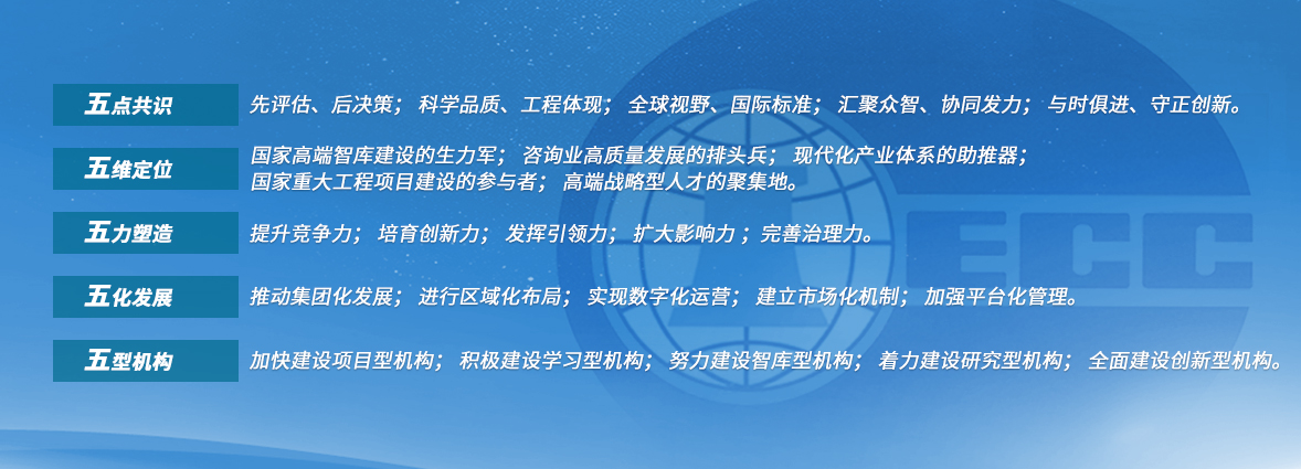 中咨公司牢記初心使命,以習(xí)近平新時(shí)代中國(guó)特色社會(huì)主義思想為指導(dǎo),落實(shí)中央加強(qiáng)中國(guó)特色新型智庫(kù)建設(shè)和促進(jìn)咨詢業(yè)高質(zhì)量發(fā)展的要求,公司正按照錨定發(fā)展目標(biāo)、夯實(shí)發(fā)展基礎(chǔ)、調(diào)整發(fā)展姿態(tài)、突出發(fā)展特點(diǎn)、取得發(fā)展成效的“五五戰(zhàn)略”,立足“五點(diǎn)”認(rèn)識(shí),強(qiáng)化“五維”定位,聚焦“五力”提升,推動(dòng)“五化”發(fā)展,建設(shè)“五型”機(jī)構(gòu),全力推進(jìn)國(guó)家高端智庫(kù)和世界一流咨詢機(jī)構(gòu)建設(shè)。