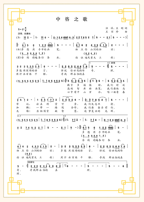 《中咨之歌》旋律優(yōu)美、抒情大氣,易上口傳唱,歌詞凝煉了公司服務(wù)國家、貢獻(xiàn)社會的歷史傳承,凸顯了新時(shí)期高端智庫建設(shè)的宗旨目標(biāo),展現(xiàn)了中咨人志存高遠(yuǎn)、矢志不渝、開拓創(chuàng)新、追夢筑夢的精神風(fēng)貌。曾獲得中國職工音樂家協(xié)會和國資委新聞中心聯(lián)合舉辦的2016中國職工好歌曲創(chuàng)作征集評選活動(dòng)“優(yōu)秀創(chuàng)作歌曲”表彰,并在權(quán)威雜志《歌曲》刊發(fā),中國曲譜網(wǎng)選登發(fā)表。