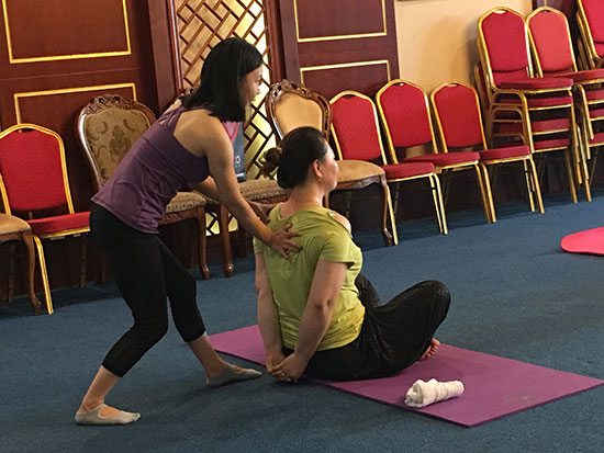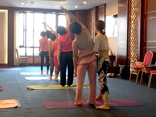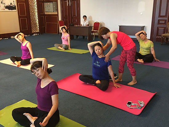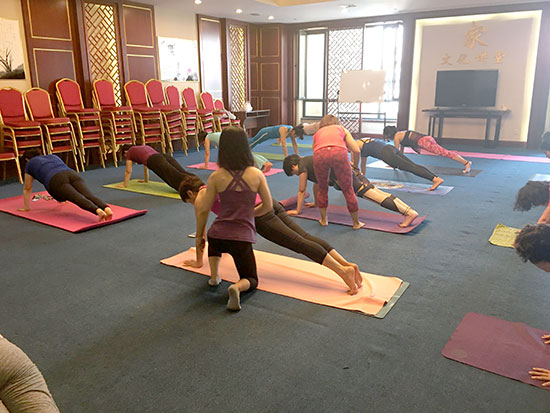 悄悄走近活動現(xiàn)場,金海大廈三樓大講堂里飄揚(yáng)著舒緩的音樂,伴隨著輕柔的指導(dǎo)聲娓娓傳來,20多位業(yè)主們正在專業(yè)老師的帶領(lǐng)下學(xué)習(xí)瑜伽動作。