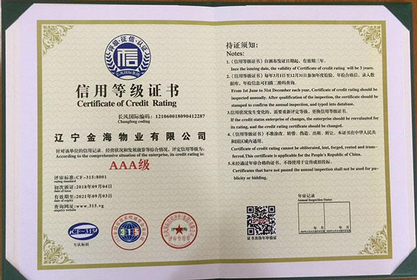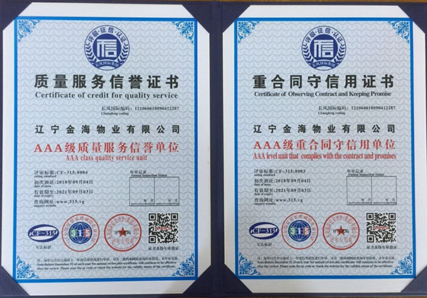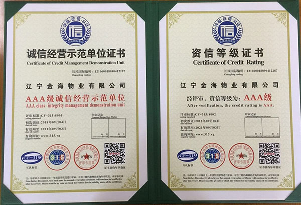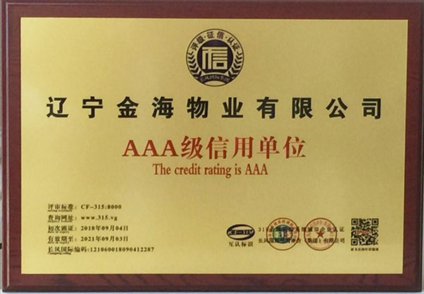 【AAA級信用企業(yè)資質(zhì)】是物業(yè)企業(yè)招投標(biāo)準(zhǔn)入必備的資質(zhì),為提升企業(yè)榮譽形象,增加投標(biāo)談判砝碼,擴大金海物業(yè)在丹東市場的占有份額,物業(yè)總公司從8月中旬開始準(zhǔn)備相關(guān)申報材料,歷時半個月,于9月4日通過了AAA級全國信用等級的驗證(可通過全國信用等級公示系統(tǒng)查詢http:www.315.vg),取得了AAA級信用單位、信用等級證書、質(zhì)量服務(wù)信譽證書、重合同守信用證書和誠信經(jīng)營示范單位證書,為金海物業(yè)在物業(yè)管理行業(yè)方面提高了核心竟?fàn)幜Α?/span>